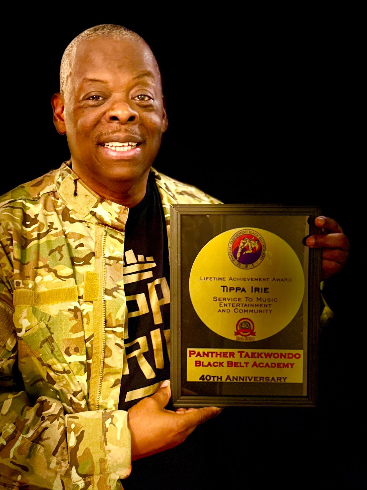 In honor of all the work that Tippa Irie has done over the years to help and inspire young people in Brixton, he was recently presented with a lifetime achievement award for service and entertainment to the community. This was presented at his recent performance at The Electric Brixton from Ewan Briscoe of the Panther Taekwondo Black Belt Academy. Check out the award and acceptance speech. The night was FIRE followed by the great Eek-a-Mouse, Dawn Penn and Scientist.
